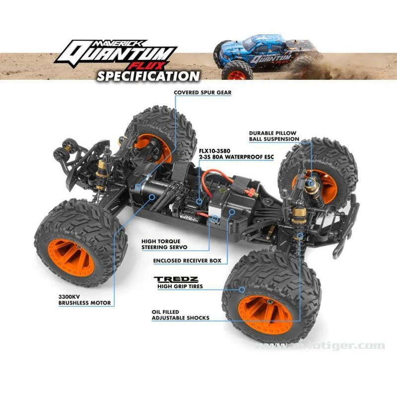 In effetti, quando si tratta di potenza, la gamma Maverick Quantum è la prima a presentare HPI Racings ‘ Sistema brushless FLUX con marchio – Quindi ottieni un motore brushless da 3300KV nel Quantum MT FLUX, in grado di funzionare con un 3S! E non preoccuparti, per aiutarti a gestire tutta quella potenza, abbiamo potenziato questo camion con alberi di trasmissione universali anteriori e mozzi esagonali in alluminio!