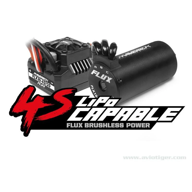 Installato per la prima volta nella gamma Maverick, la coppia formata dal FLX10-4S120 Flux 120 A azionamento e motore Brushless impermeabile FLX10-3675-2250KV offre una potenza inarrestabile! Il tutto con la possibilità di gestire una batteria LiPo 4S (ovvero 14,8 volt di alimentazione LiPo!)