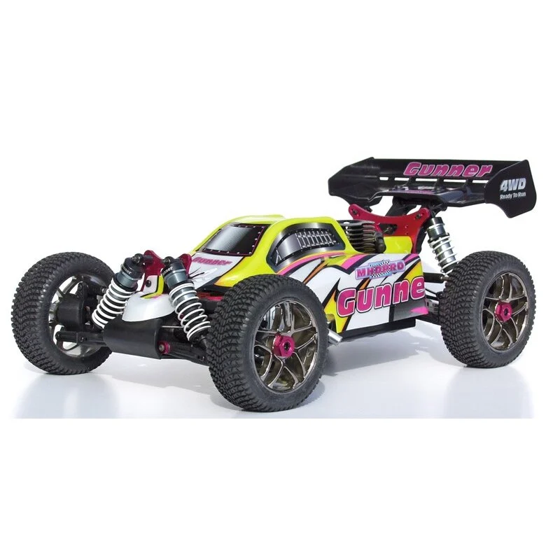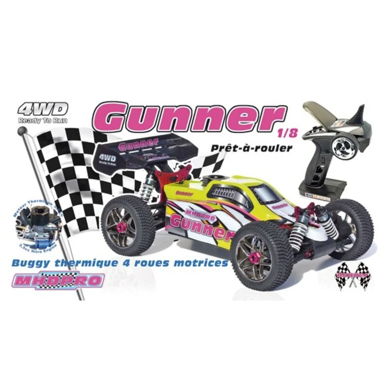 ● MHDPRO Gunner: Questo buggy RC è destinatoa tutti i conducenti RC, principianti o esperti. Questo veicolo ricreativo è un potente modello fuoristrada. Pronto per il rotolamento, il modello è completamente assemblato e decorato. È alimentato da un motore da 3,5 cc con un carburatore a cassetto e un avviatore estrattore.
